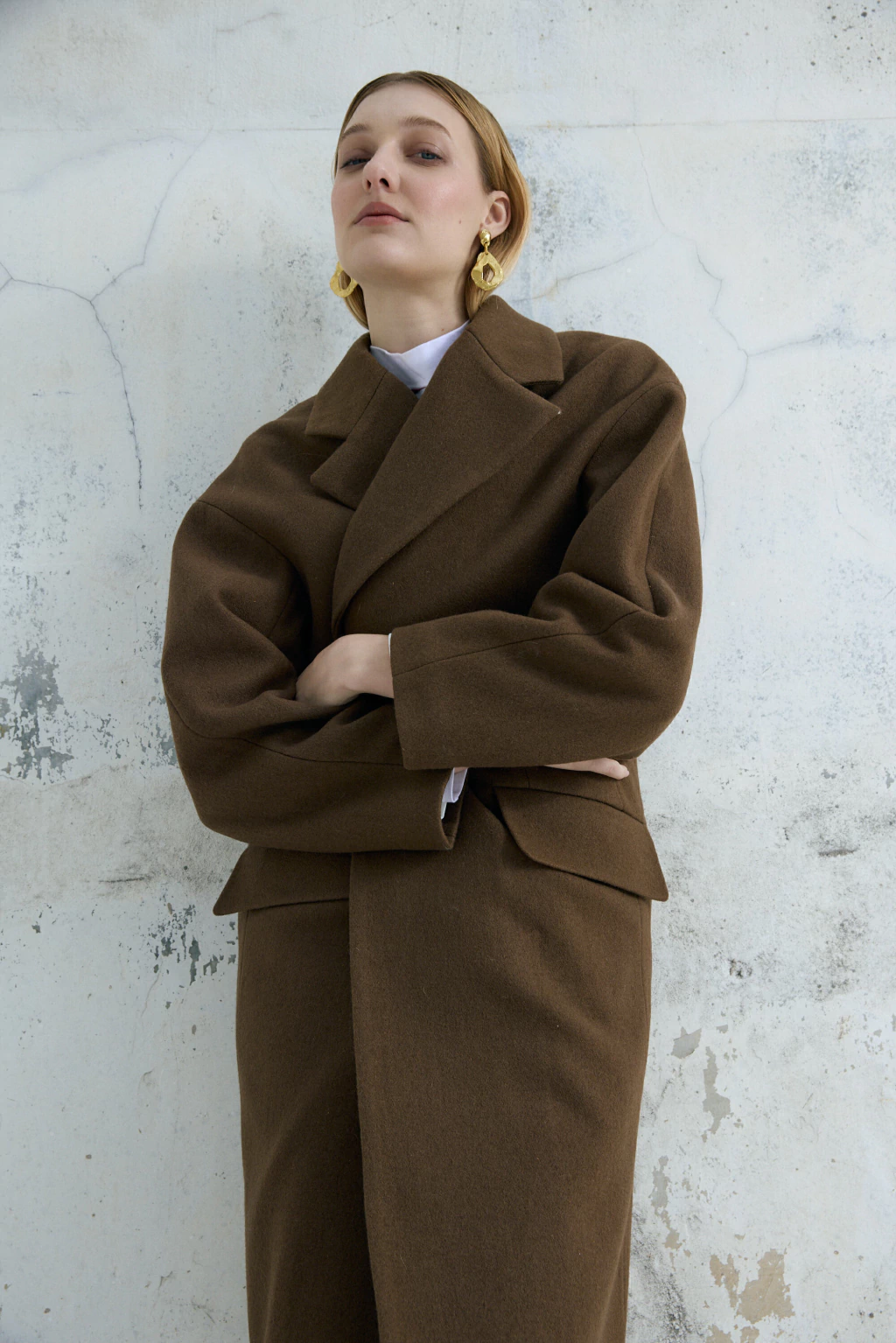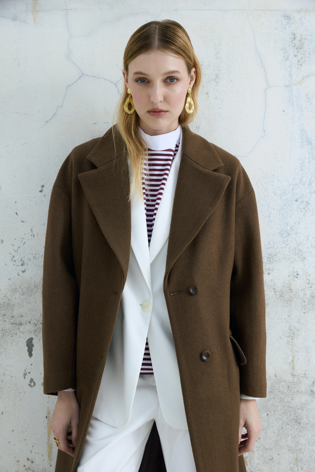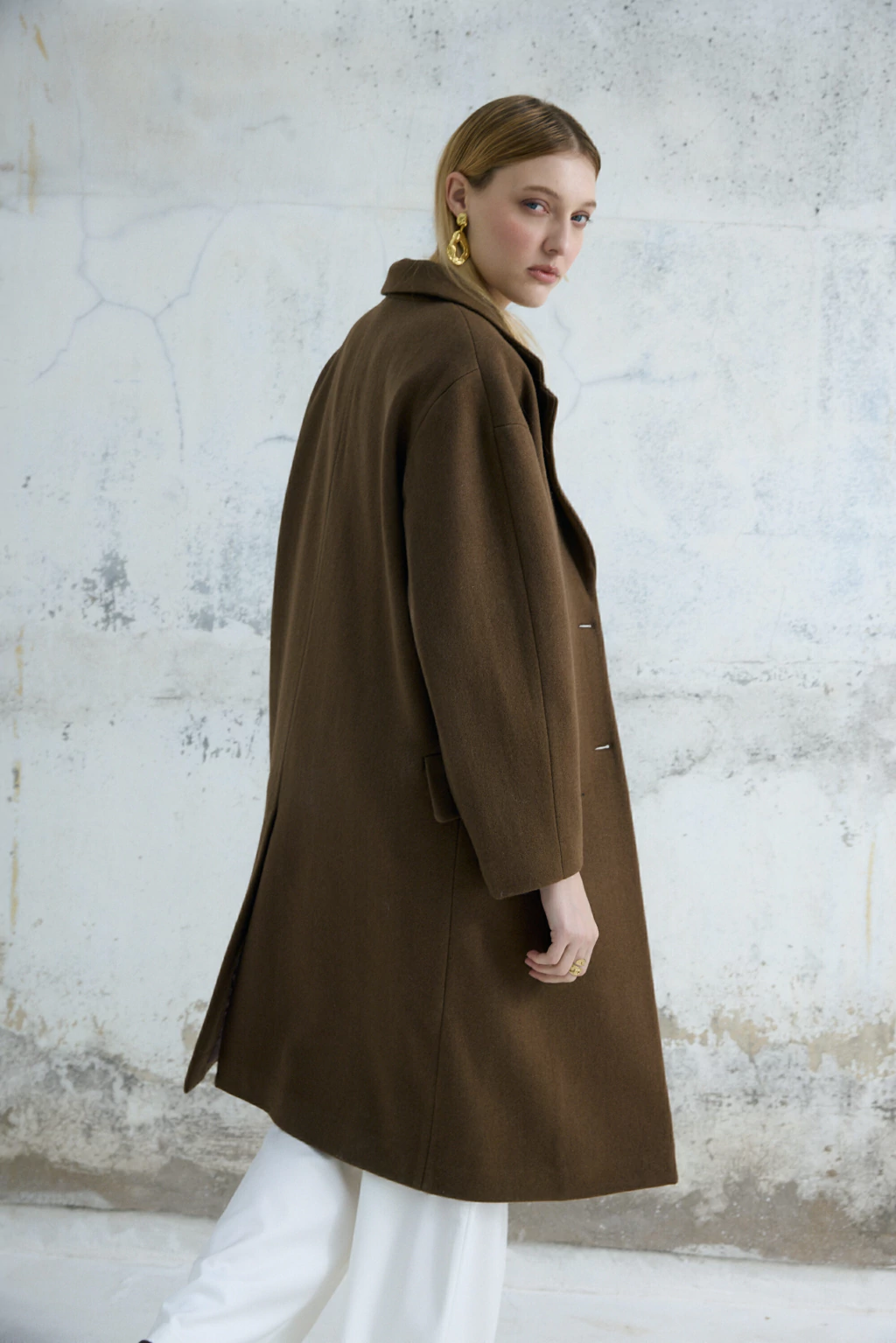 Tapado confeccionado en 100% lana, de corte recto y calce oversize es un esencial de temporada. Su tono chocolate lo convierte en un clásico moderno, fácil de combinar. Cuenta con cruce de dos botones, bolsillos laterales funcionales y una caída impecable que aporta estructura sin perder comodidad. Tiene en su interior una forreria premiuim a tono con el paño.